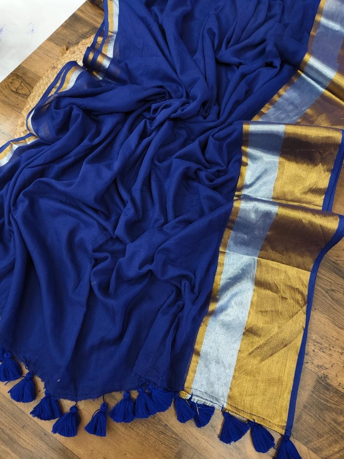 Royal Blue Mulcotton saree with a beautiful golden and silver border. Comfortable, elegant, perfect for any occasion.