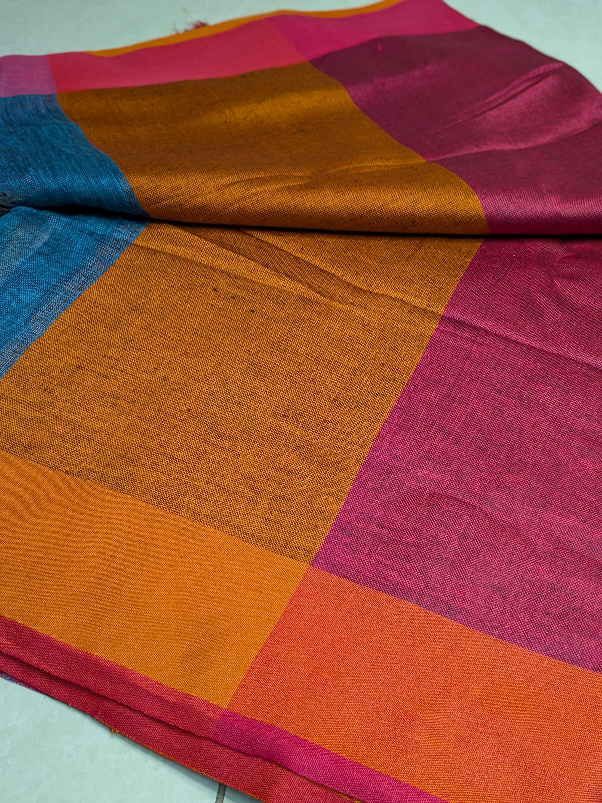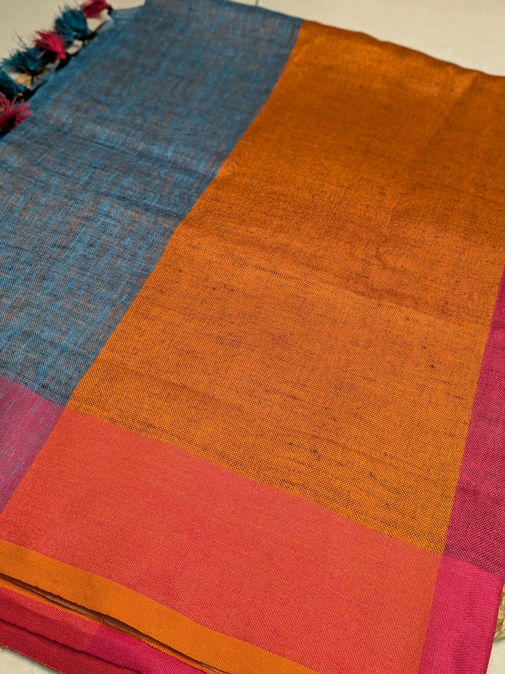 Pure handloom linen saree featuring a striking blue body paired with a playful twist — a vibrant orange border on one side and a charming pink on the other. A unique blend of elegance and contemporary flair, perfect for making a statement.