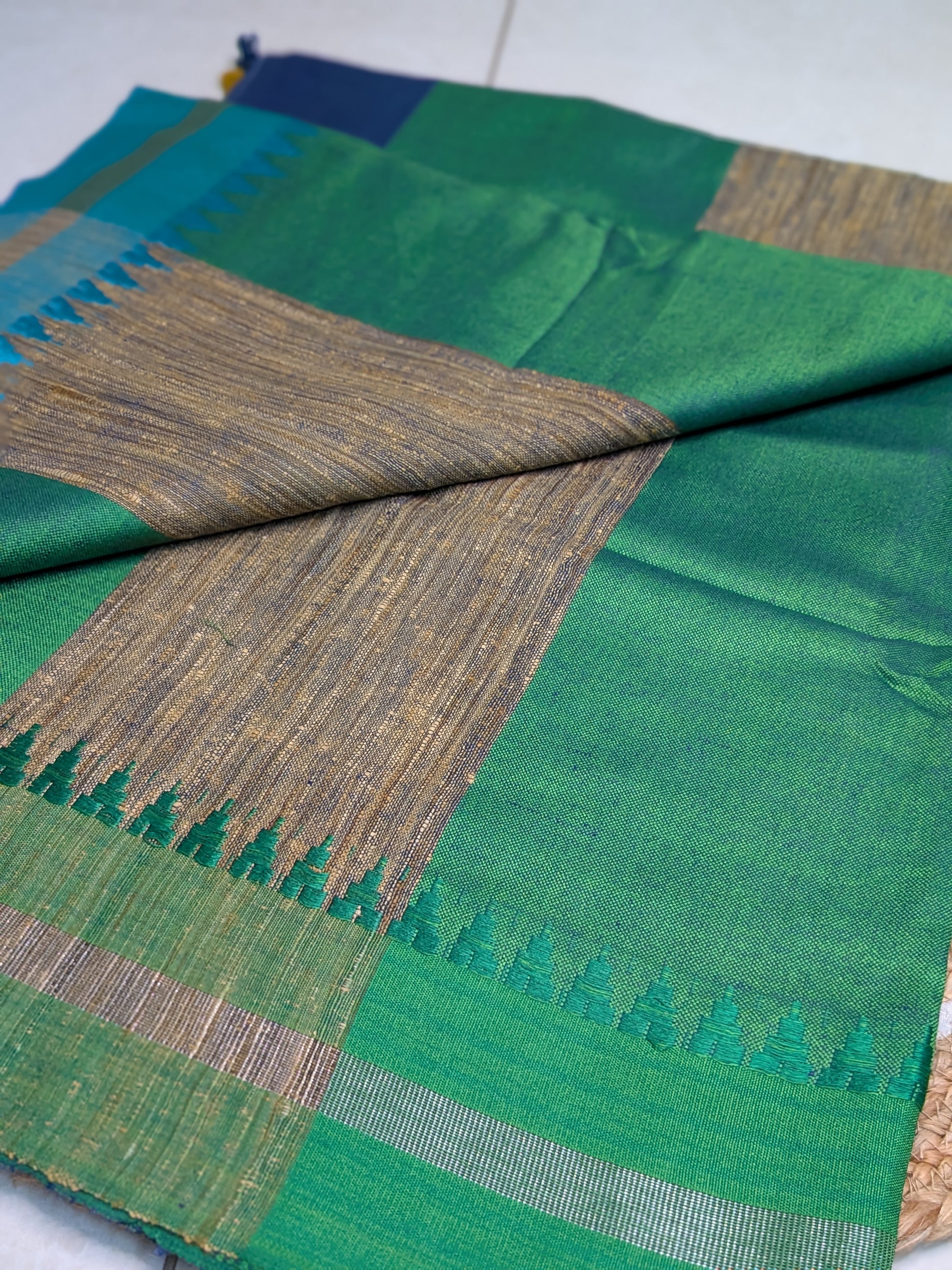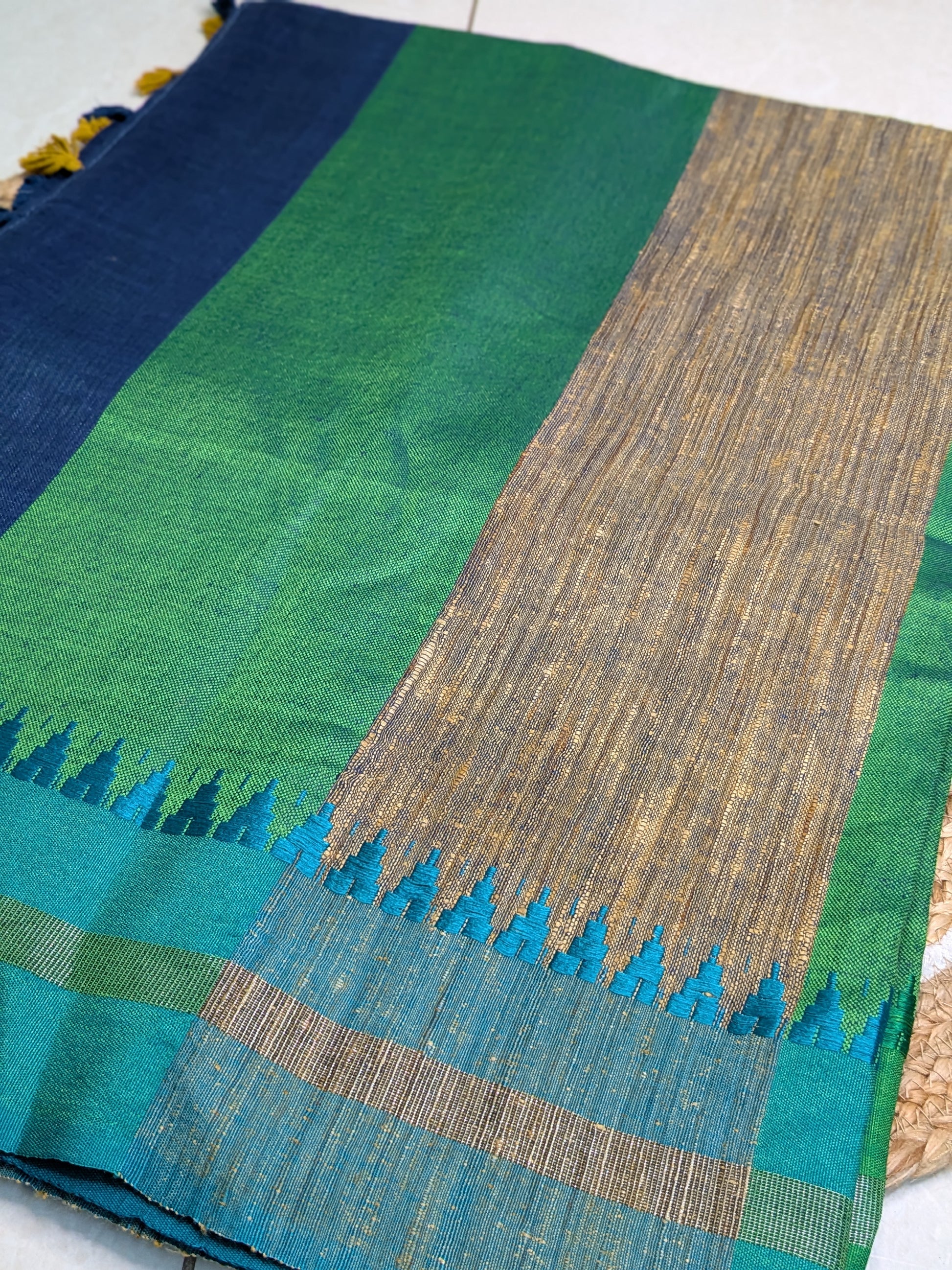 Pure handloom linen saree with a rich blue body, paired with a green border on one side and a blue border on the other, both adorned with delicate temple motifs. A perfect union of vibrant hues and timeless craftsmanship.