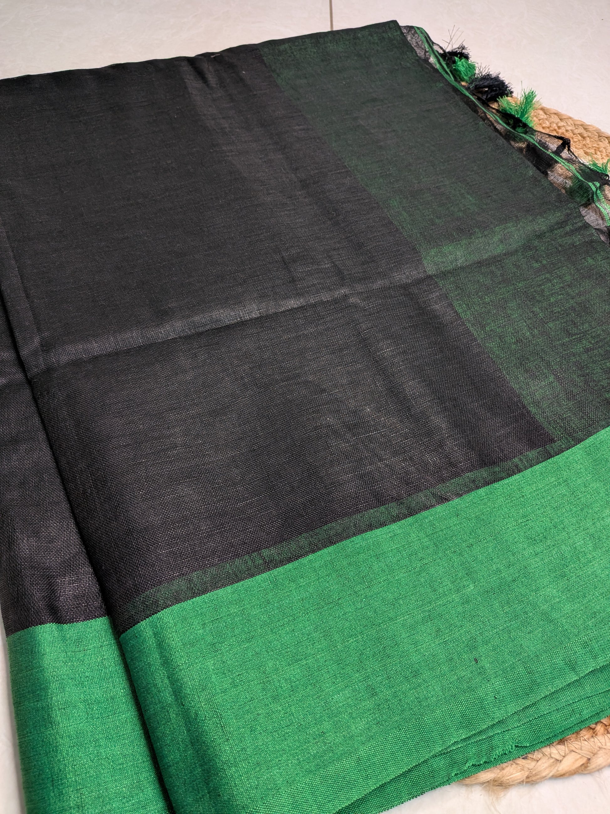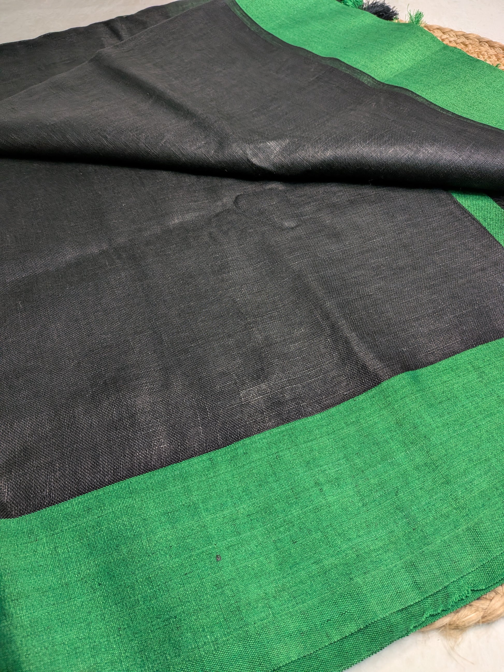 Pure handloom linen saree in a striking black body, framed with a rich green border. Paired with a matching green blouse, this piece blends bold sophistication with understated elegance, making it perfect for both festive gatherings and refined everyday wear.
