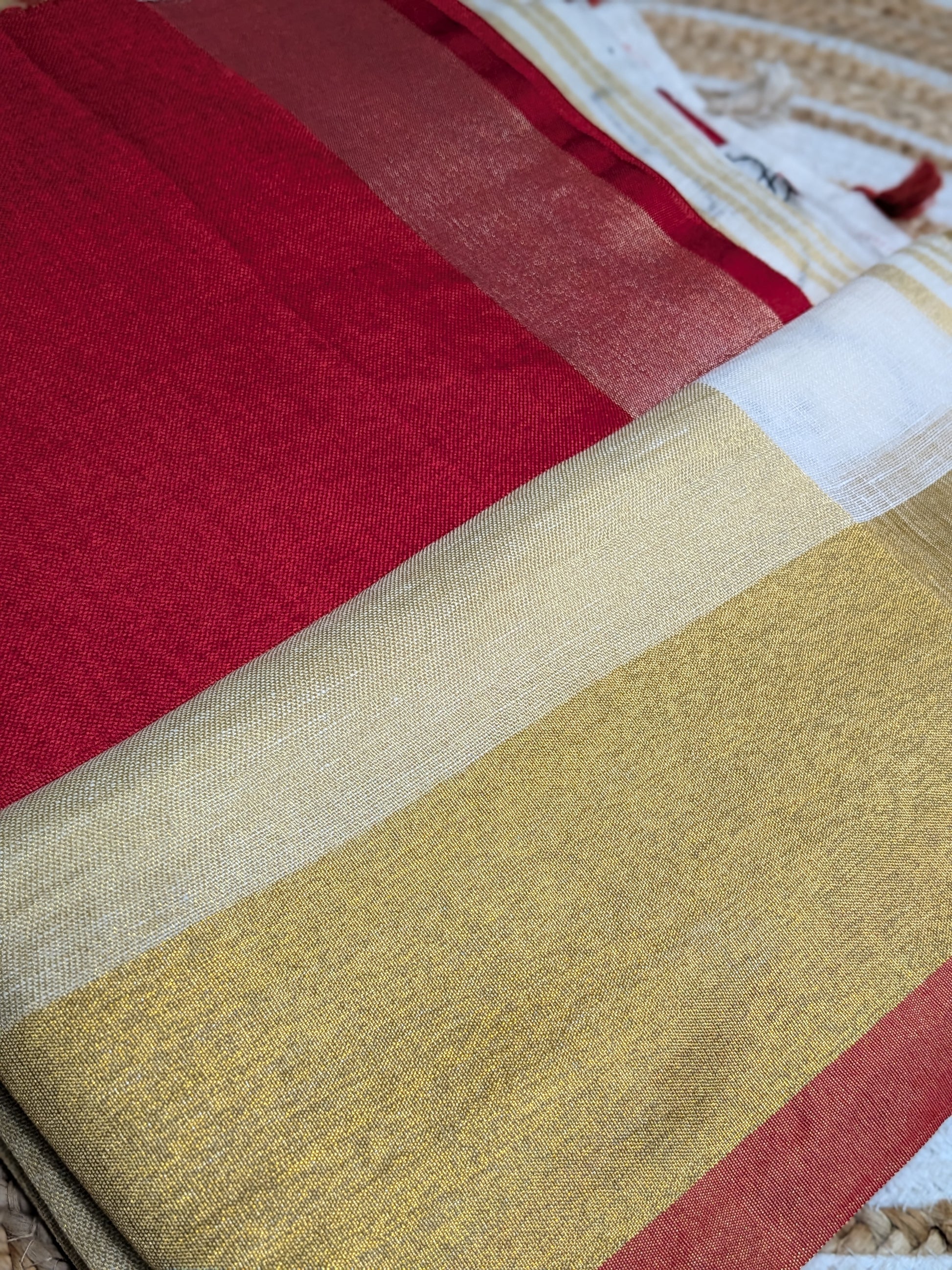 A pure linen masterpiece in a serene white body, adorned with a lustrous golden zari border. Paired with a vibrant red blouse featuring a matching zari border, this saree radiates effortless elegance and classic appeal, perfect for any festive or graceful occasion.