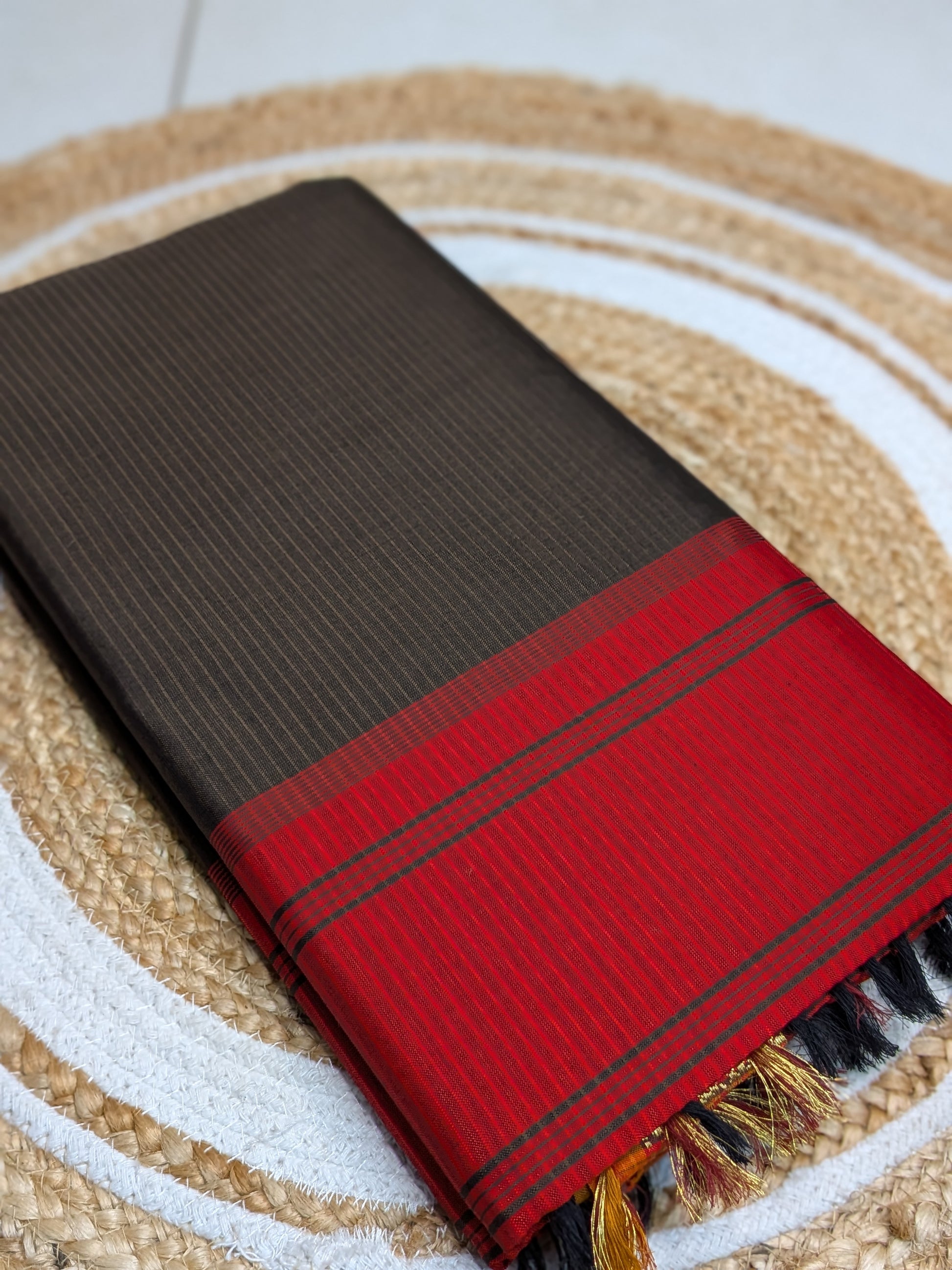 A soft blend of brown and red tones, this polycotton saree offers a subtle charm and lightweight comfort. An ideal pick for graceful everyday wear with a hint of tradition.