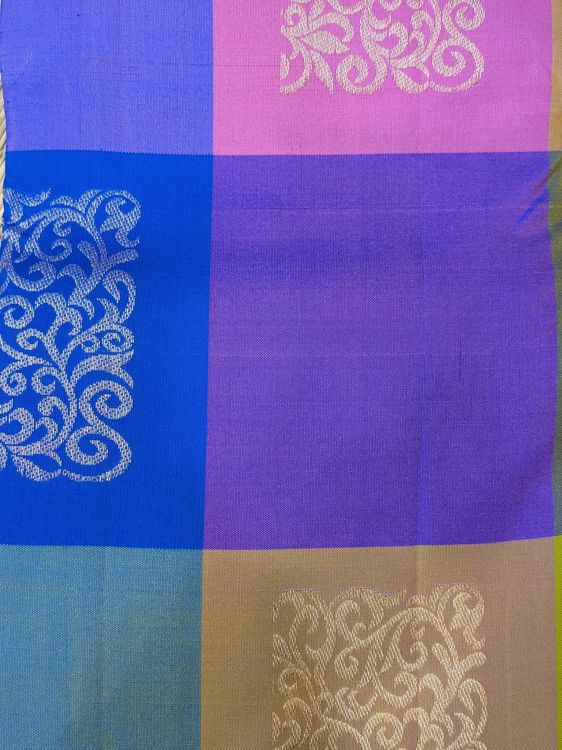 A stunning Kanchipuram pure handloom silk saree featuring traditional Paalum Pazhamum checks in vibrant pink, blue, and green.Effortlessly elegant in its simplicity, Nirantara celebrates the seamless grace of traditional weaving