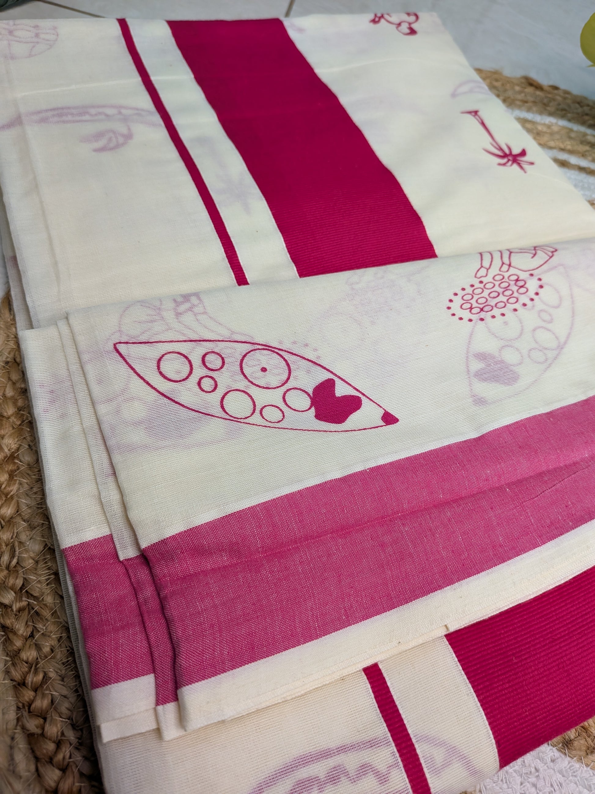 Ponnonam - Kerala Cotton Saree with Pink Border & Traditional Prints