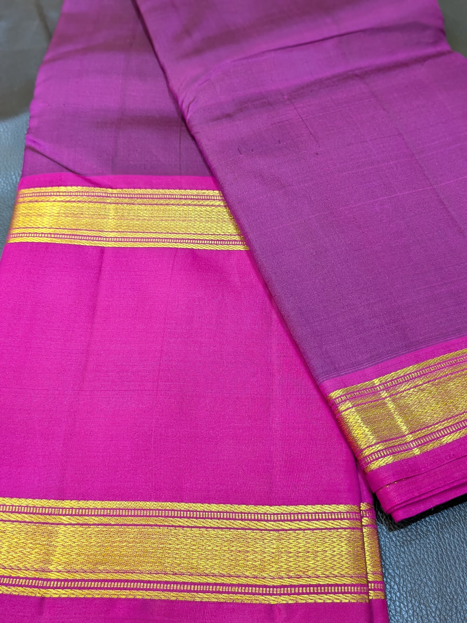 Immerse yourself in timeless grace ,a pure handloom Kanchipuram saree in vibrant rani pink rettapet border, adorned with rich golden zari borders. This saree blends bold tradition with refined elegance – perfect for festive moments and graceful occasions.