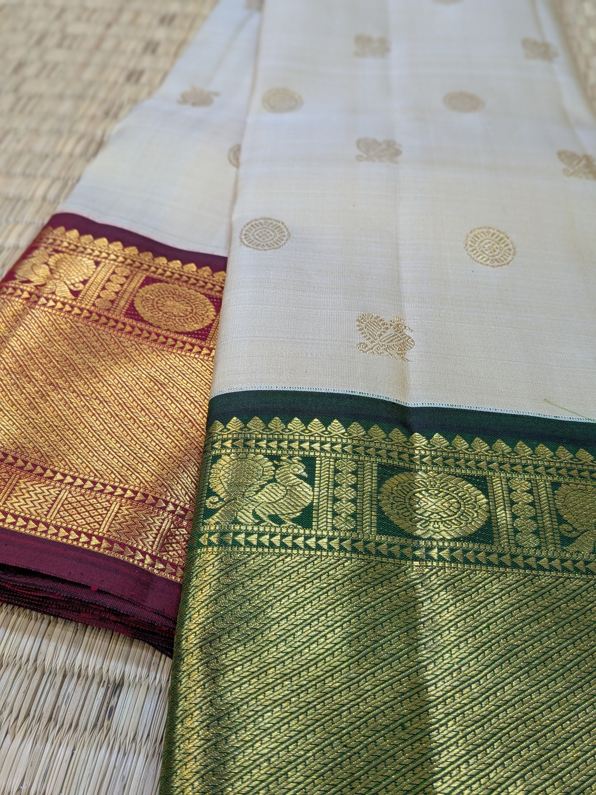 A classic off-white Kanchipuram handloom saree with striking Ganga Jamuna borders — deep bottle green and rich red. Embellished with peacock and chakra buttas and paired with a matching green blouse, this piece beautifully weaves tradition and elegance.