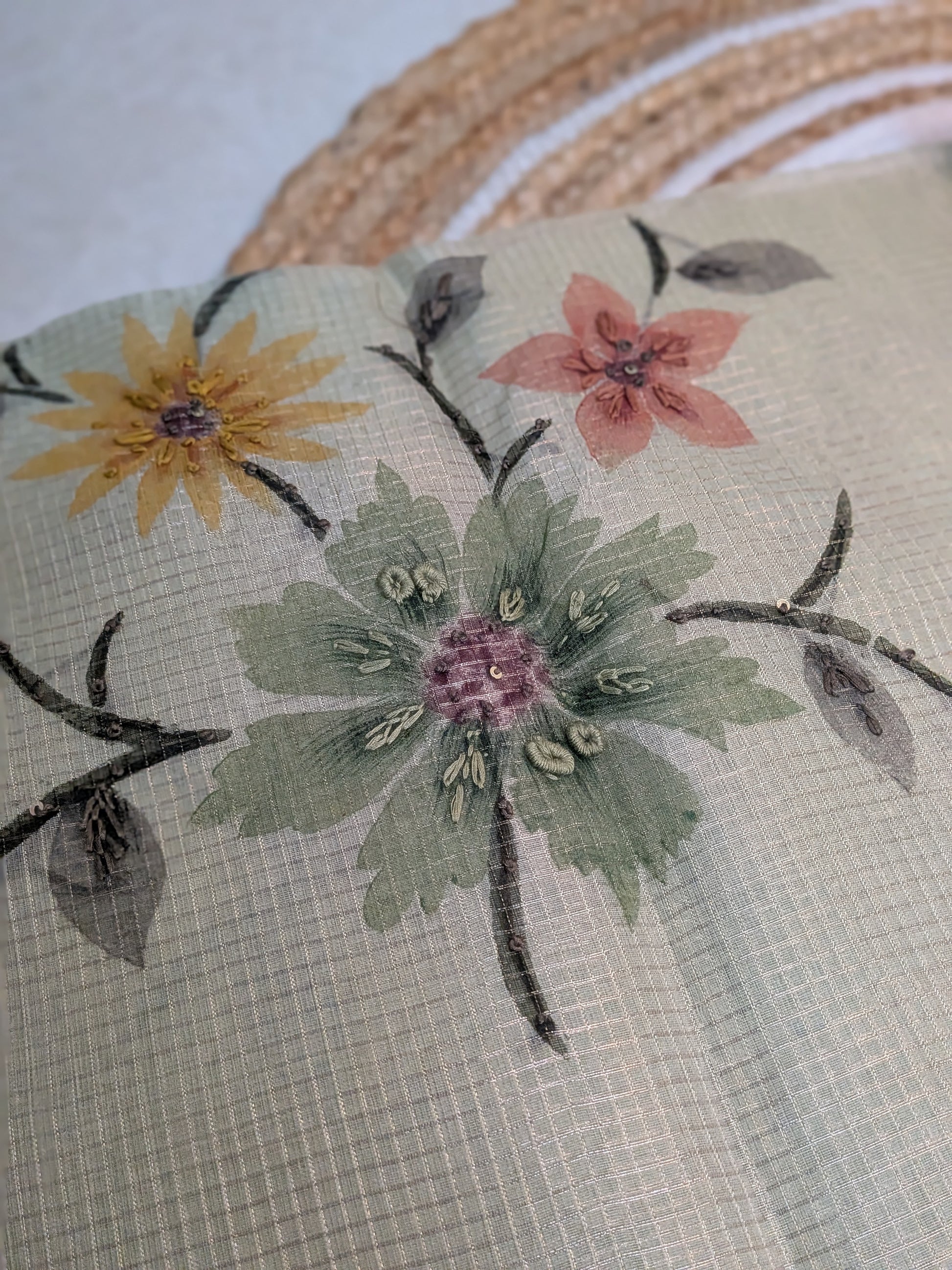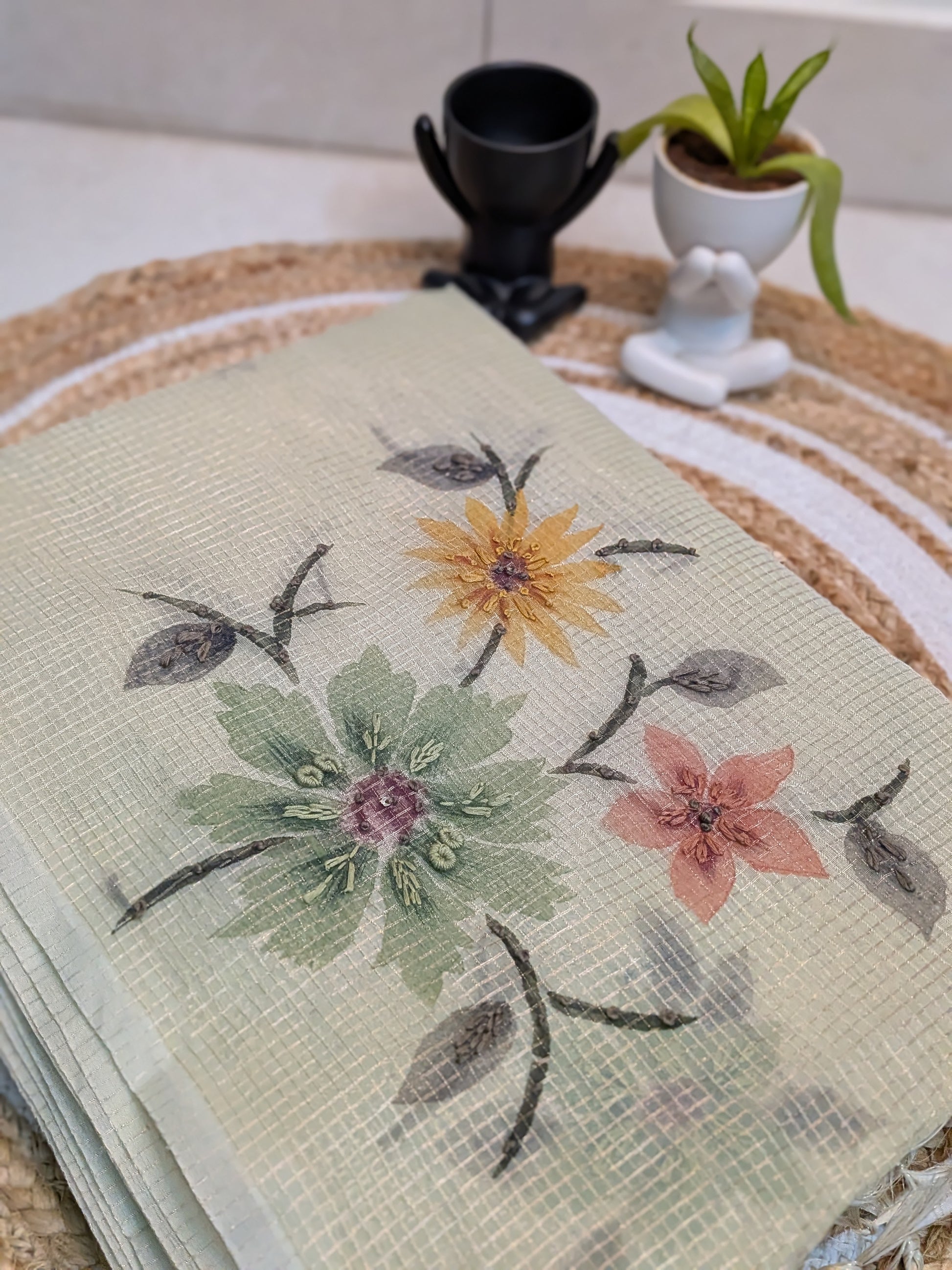Breezy and radiant, this pastel green tissue Kota saree is adorned with graceful floral embroidery. Its delicate shimmer and airy drape make it the perfect blend of subtle sophistication and festive charm.