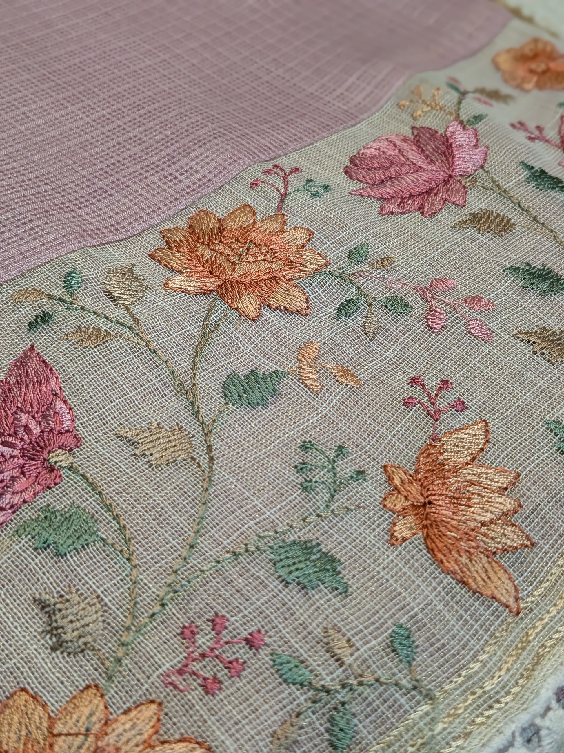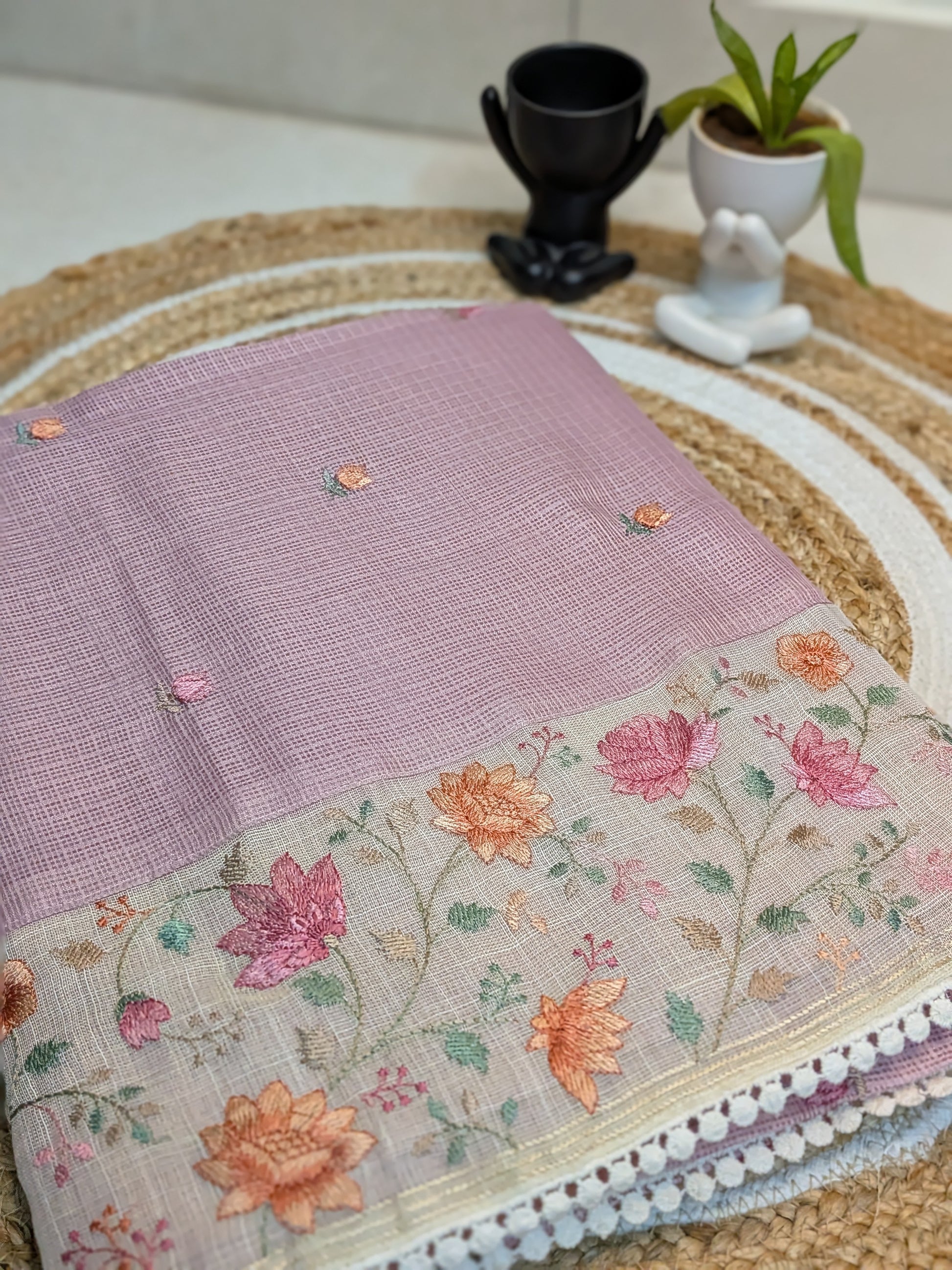 Soft and refined, this elegant pink Cotton Kota saree features intricate embroidery along its border, paired with a matching blouse detailed with delicate sleeve embroidery — a perfect blend of charm and craftsmanship.